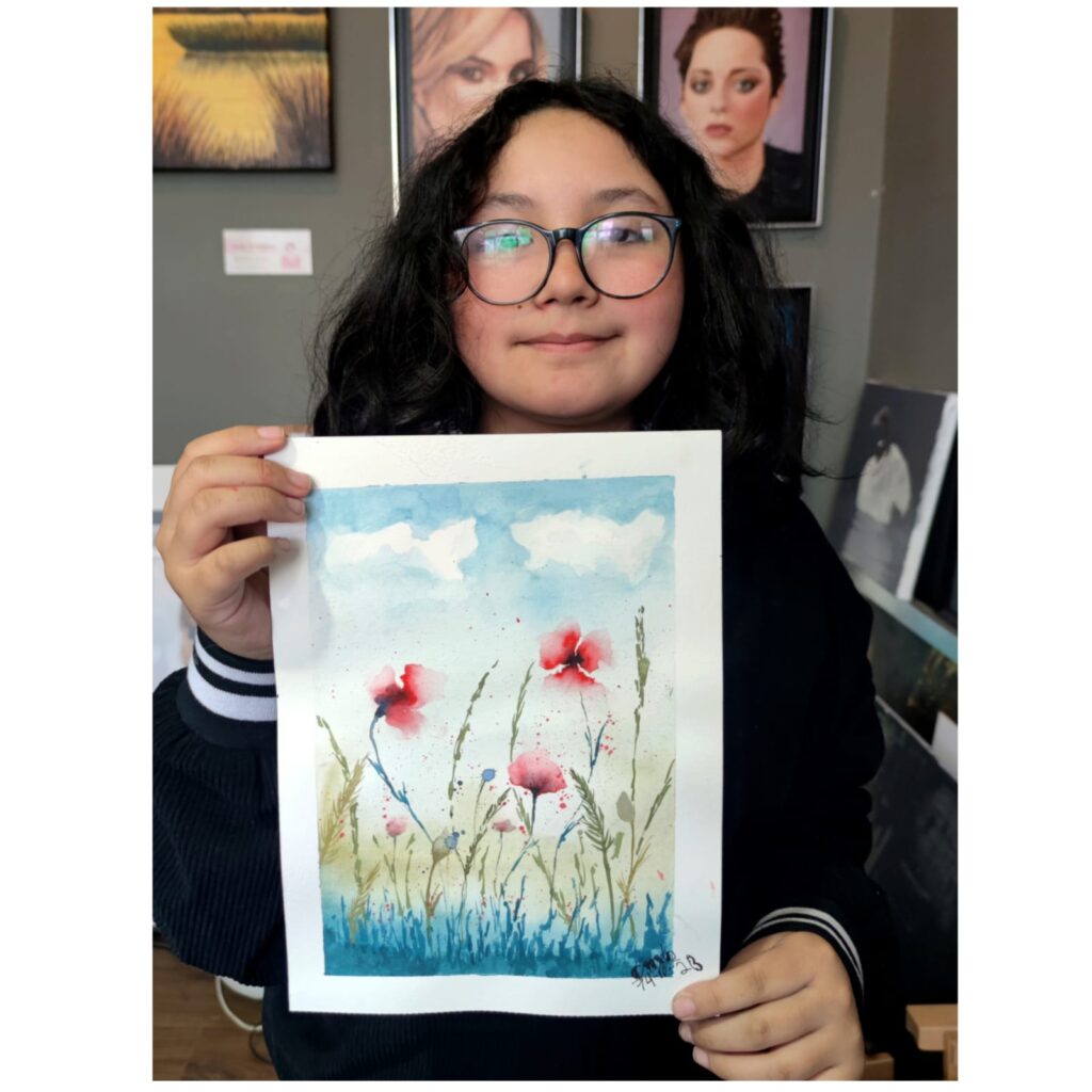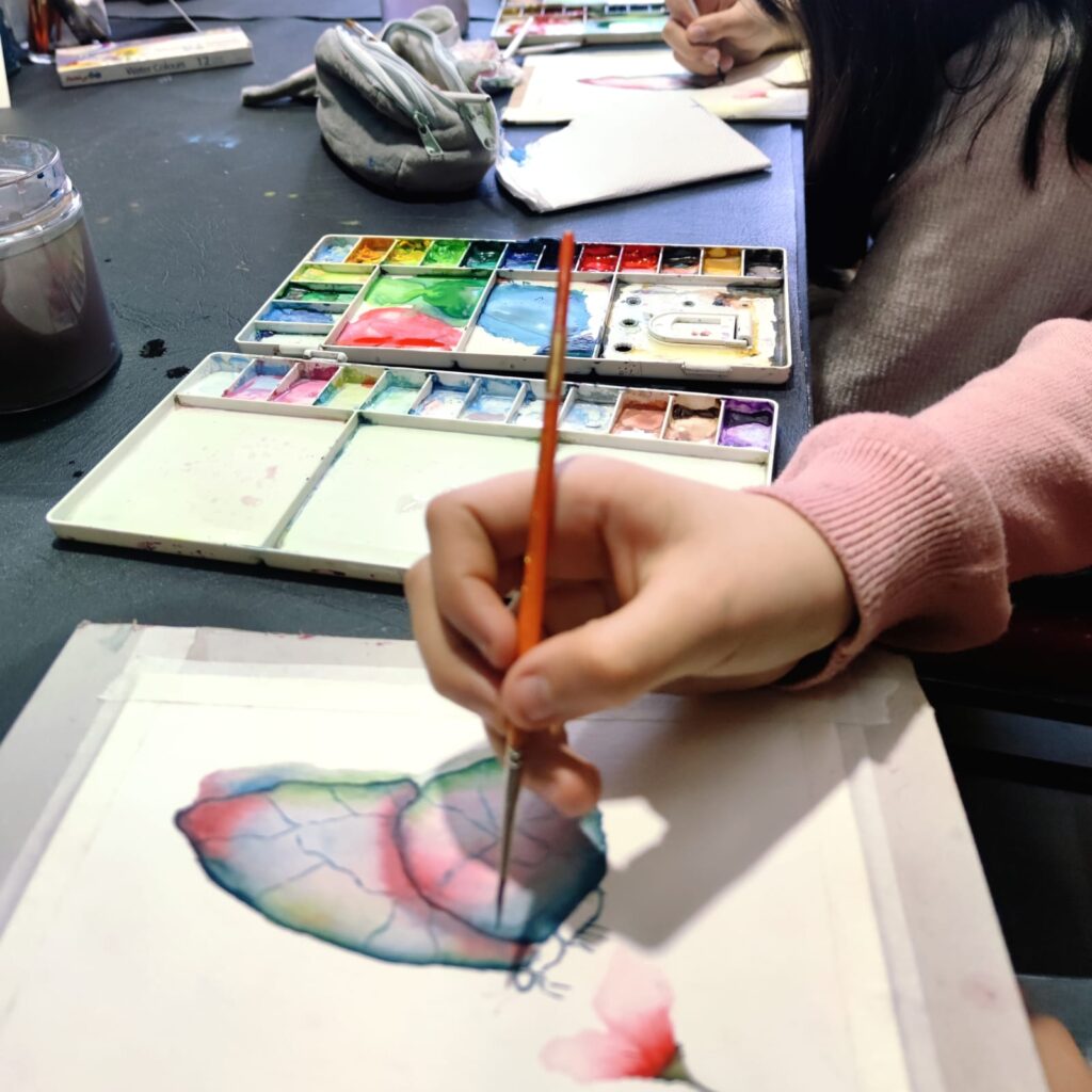De esta manera, los estudiantes van aprendiendo diferentes conocimientos y habilidades según el requerimiento técnico de cada proyecto en particular. Además de generar una colección de acuarelas de pequeño formato que le permite ir apreciando su proceso de aprendizaje y, muchas veces, crear su propia galería de arte en casa, objetos para regalar, u otros.